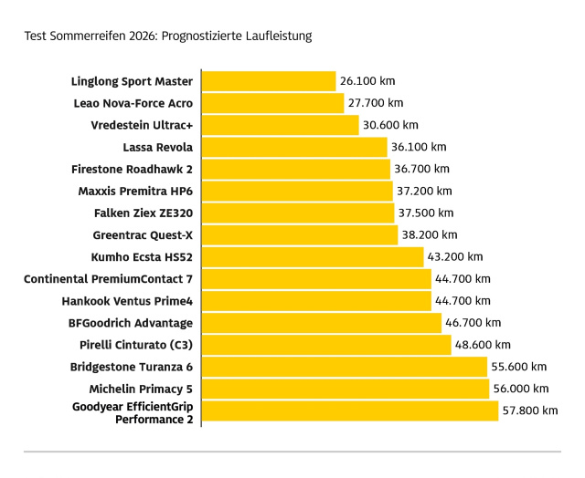 Für Verbraucher erfreulich: Die Mehrheit der getesteten Reifen ist mindestens empfehlenswert. Drei Modelle fallen allerdings klar durch. Lassa Revola (3,6), Leao Nova-Force Acro (3,8) und Linglong Sport Master (4,2) zeigen deutliche Schwächen – vor allem bei den Fahrleistungen. Der Linglong liefert ein besonders unausgewogenes Bild: Bestwert auf nasser Fahrbahn, aber massive Defizite auf trockener Strecke und eine prognostizierte Laufleistung von nur rund 26.000 Kilometern. Zum Vergleich: Der Goodyear kommt auf 57.800 Kilometer – also mehr als doppelt so viel.