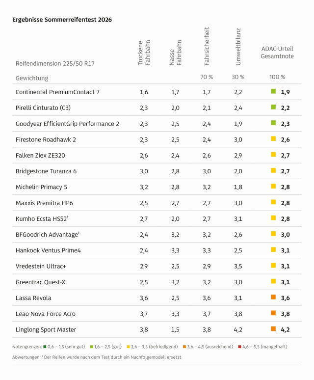 Sommerreifen müssen heute deutlich mehr können als nur bei Hitze funktionieren. Kühle Frühlingstage, plötzlicher Starkregen und lange Autobahnetappen verlangen nach ausgewogenen Allroundern. Genau hier trennt sich im aktuellen ADAC-Sommerreifentest die Spreu vom Weizen. Getestet wurde die Dimension 225/50 R17, die vor allem auf Mittelklassemodellen weit verbreitet ist.