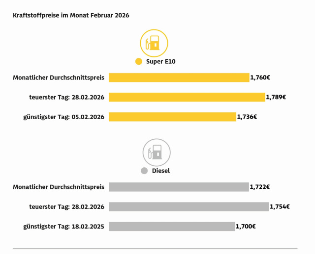 Teuerster Tag zum Tanken war das Monatsende: So kostete ein Liter Super E10 am 28. Februar im Schnitt 1,789 Euro, Diesel 1,754 Euro. Am günstigsten war Super E10 am 5. Februar mit 1,736 Euro, Diesel am 18. Februar mit 1,700 Euro je Liter.